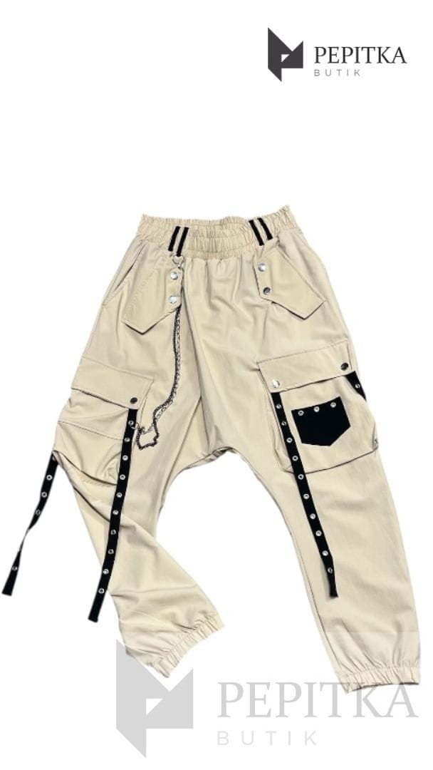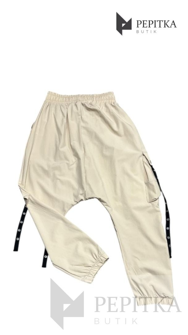 Spodnie beżowe z obniżonym krokiem z czarną kieszenią i paskami #126
